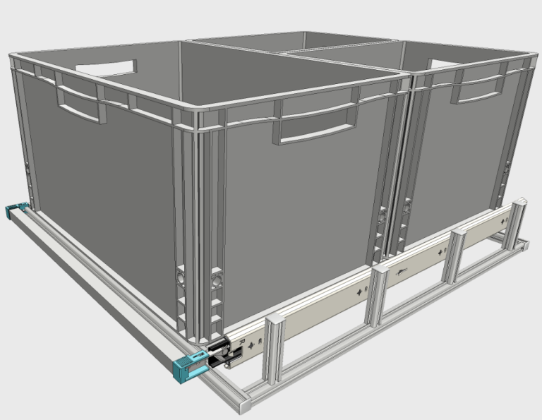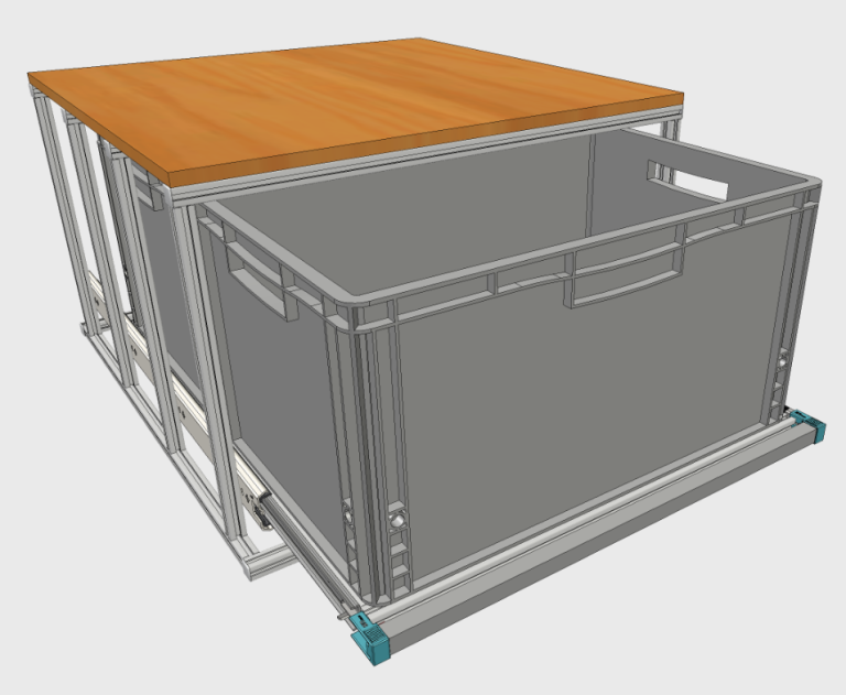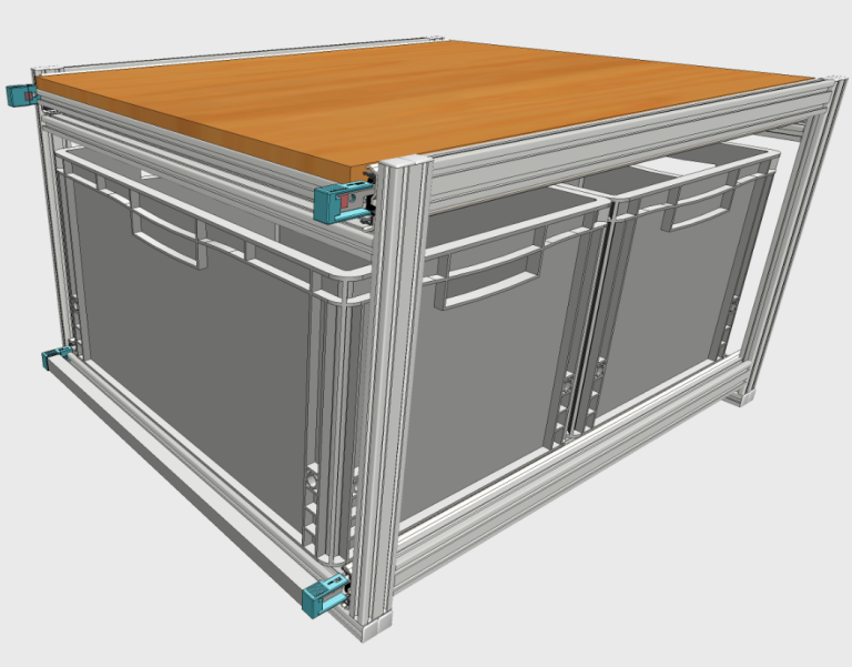 Boden bzw. an den Seitenwänden verschraubt werden. Gefertigt werden die Rahmen mit 40x20 mm Systemprofilen. Die Ebenen für die Aufnahme der Euroboxen werden mit 20x20 Systemprofile gefertigt. Alle Verbindungen werden durchverschraubt, hierzu werden die Profile gebohrt und entsprechend mit Gewinde versehen. Es kommen keine Systemwinkel zum Einsatz.