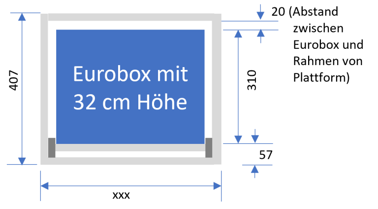 Wie im Beispiel aufgeführt ergibt sich bei einem Plattformauszug und Euroboxen in der Höhe von 32cm eine Mindesthöhe von 407 mm für das Auszugssystem bei Auszugsschienen mit 100 kg Traglast.